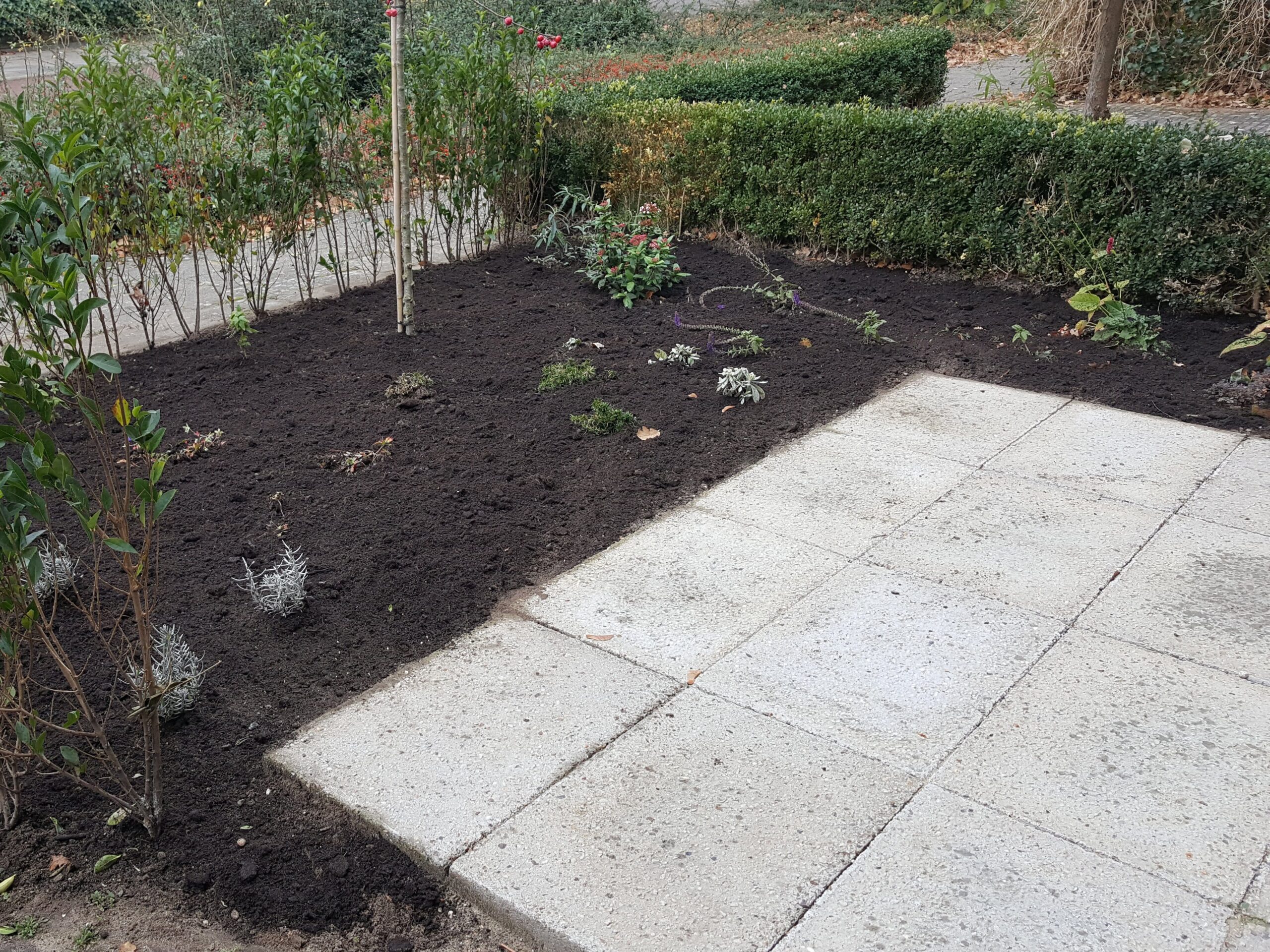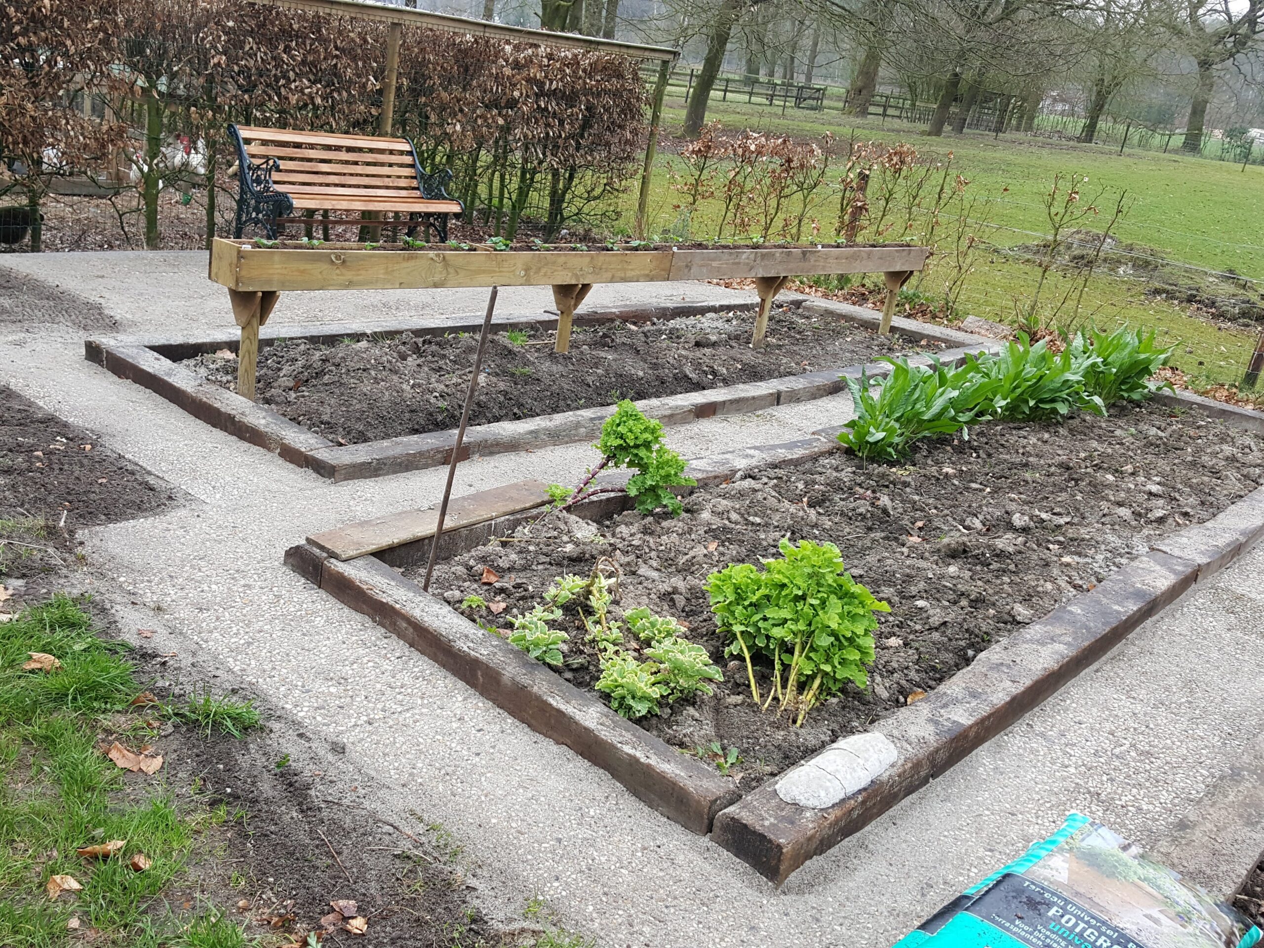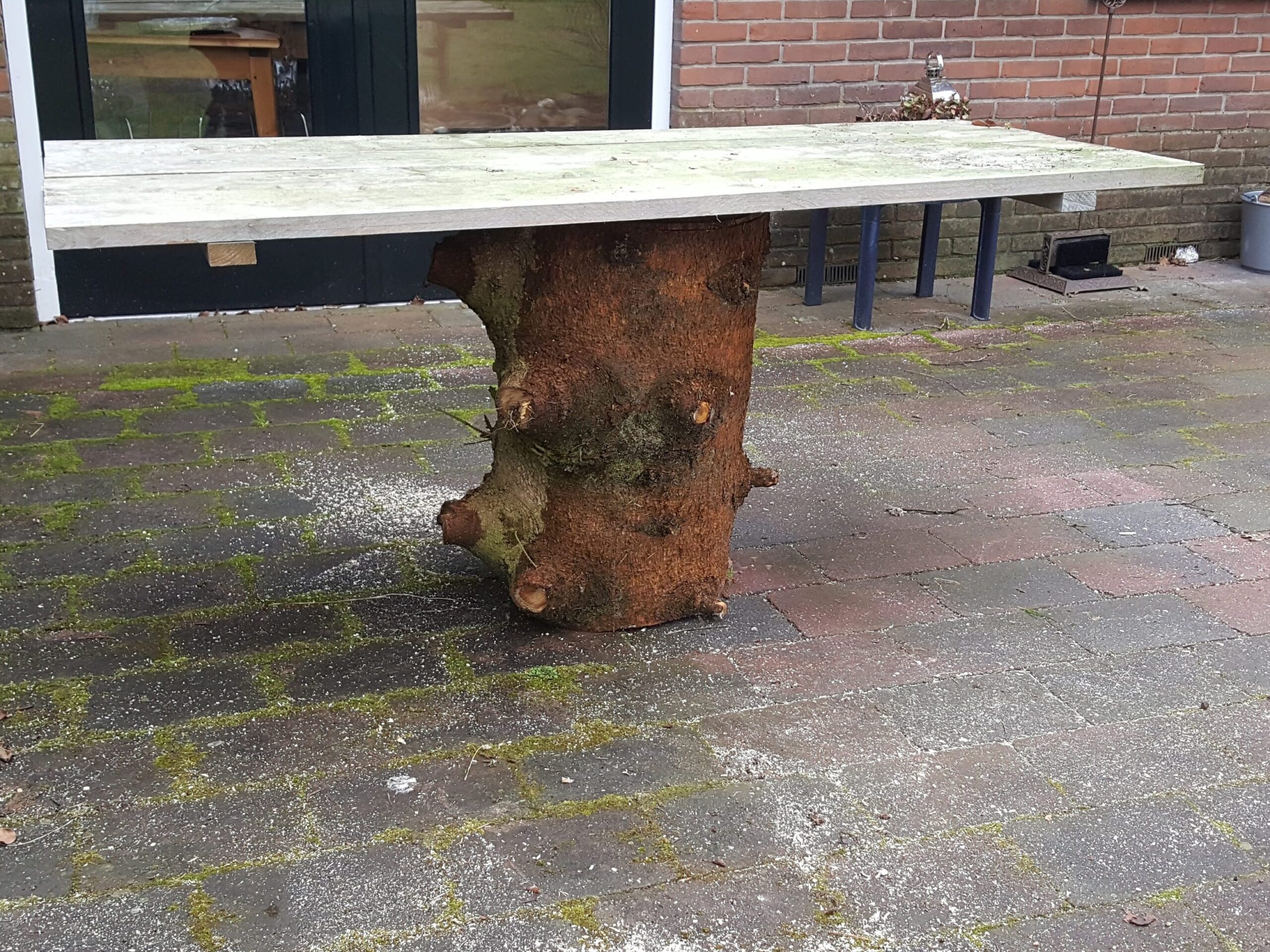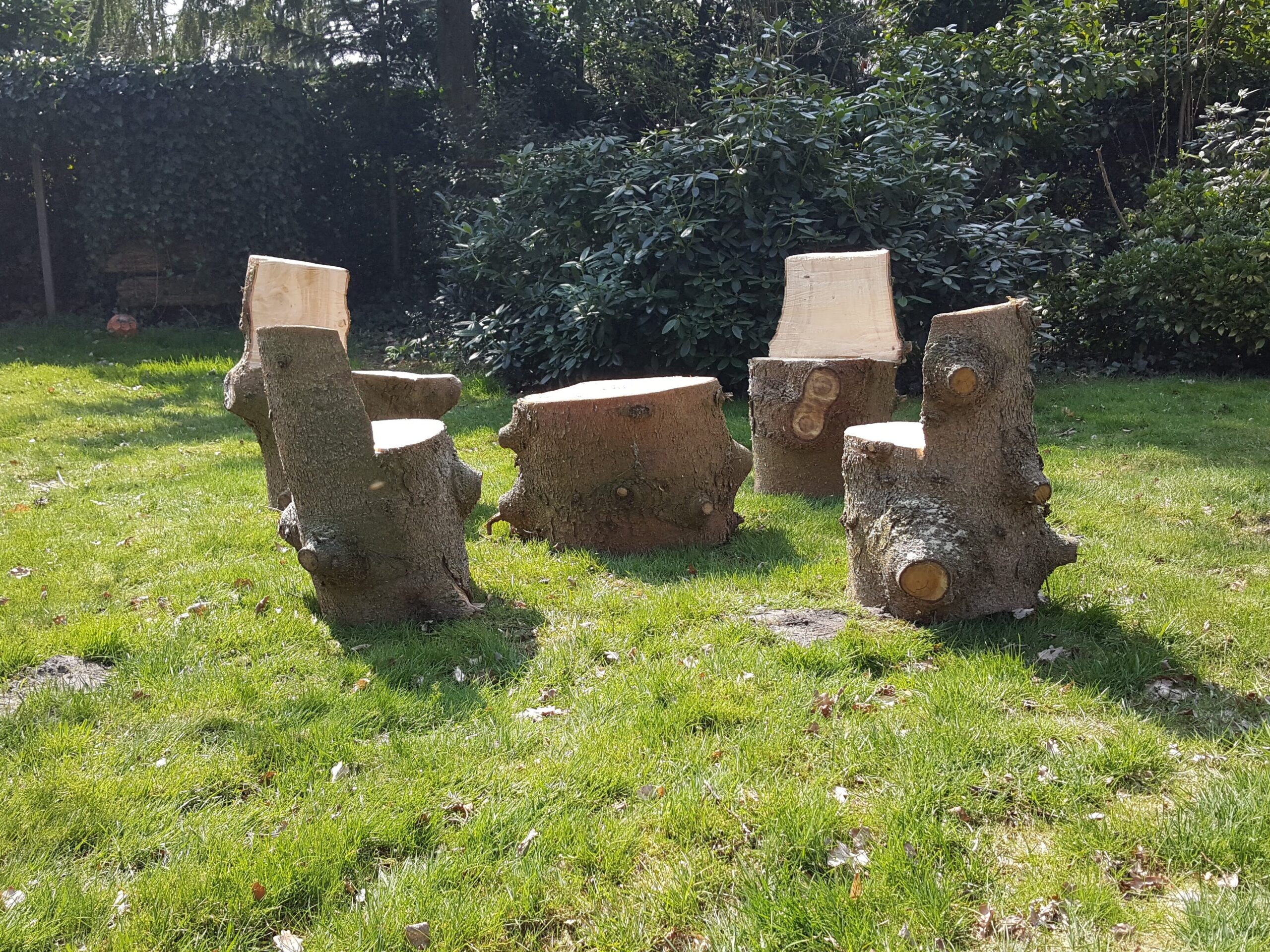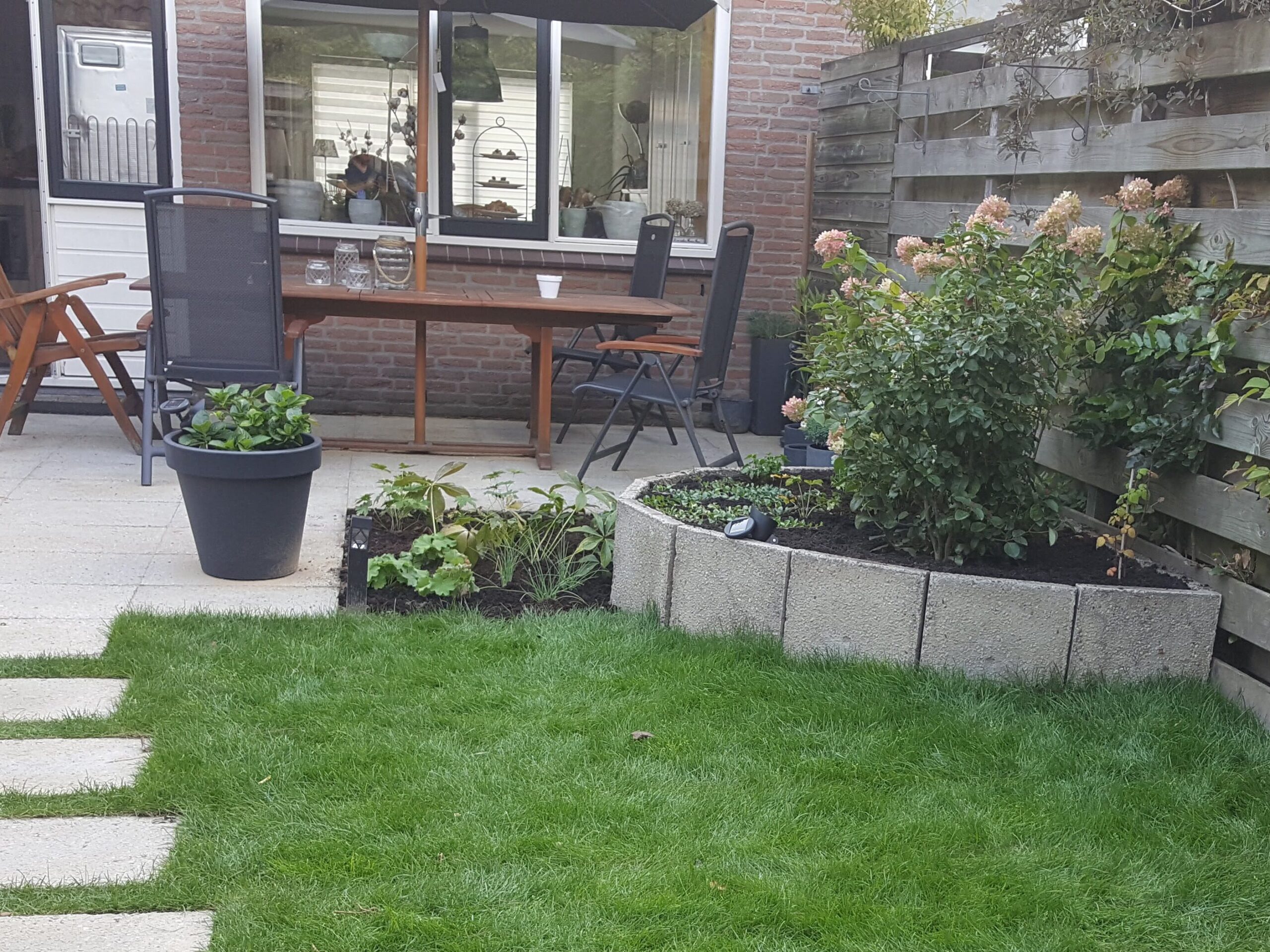 Wij zijn gespecialiseerd in het duurzaam renoveren en onderhouden van tuinen. Een van de basis uitgangspunten hiervoor is zo min mogelijk afval af moeten voeren. Daarvoor kunnen we volop onze creativiteit inzetten in de op locatie aanwezige materialen. Zo maakten van een omgewaaide boom leuke sier zitjes en verwerkten we een gedeelte zelfs in een tuintafel. We gebruiken grindtegels omgedraaid als terras en stapstenen of als verhoogde border. Op de eerste foto hieronder te zien als hele tegels, maar we verwerken (grind)tegels ook vaak gebroken in een stapelmuur. Bij een ander project maakten we verhoogde groentebedden van overbodige spoorbielzen.